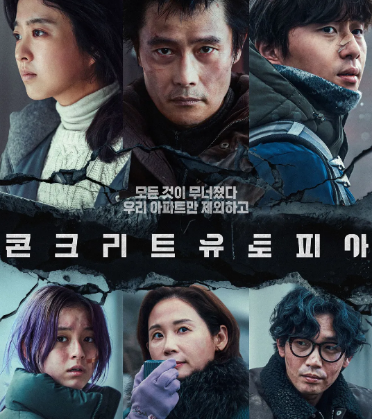 〈콘크리트 유토피아〉는 엄태화 감독이 연출한 2023년 재난, 스릴러로 웹툰 〈유쾌한 왕따〉 일부를 영화화한 작품입니다. 거대한 지진 이후 서울이 폐허가 되고, 기적처럼 멀쩡히 남은 황궁아파트 한 동에서 벌어지는 생존기를 다룹니다. 이병헌, 박서준, 박보영 같은 대 배우들이 나오며 한국형 재난 영화라기보단 재난 이후 인간 군상을 까뒤집는 블랙 코미디에 가깝다는 평가를 받았습니다.
